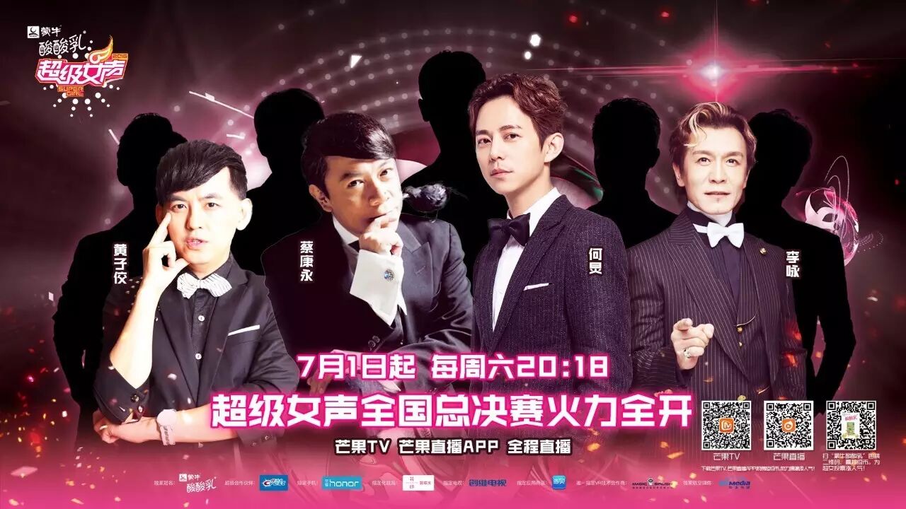 噢,对了!除了歌手界和演员界的男神,主持界的国产男神们也会强势加入哦!由何炅、蔡康永、李咏、黄子佼组成的亚洲最强MC天团将接力主持超级女声总决赛。辣么,7月1日的第一场总决赛,会是他们中的谁惊喜现身为超女助力呢?看直播就知道辣!还是四人合体?你们自行想象吧!