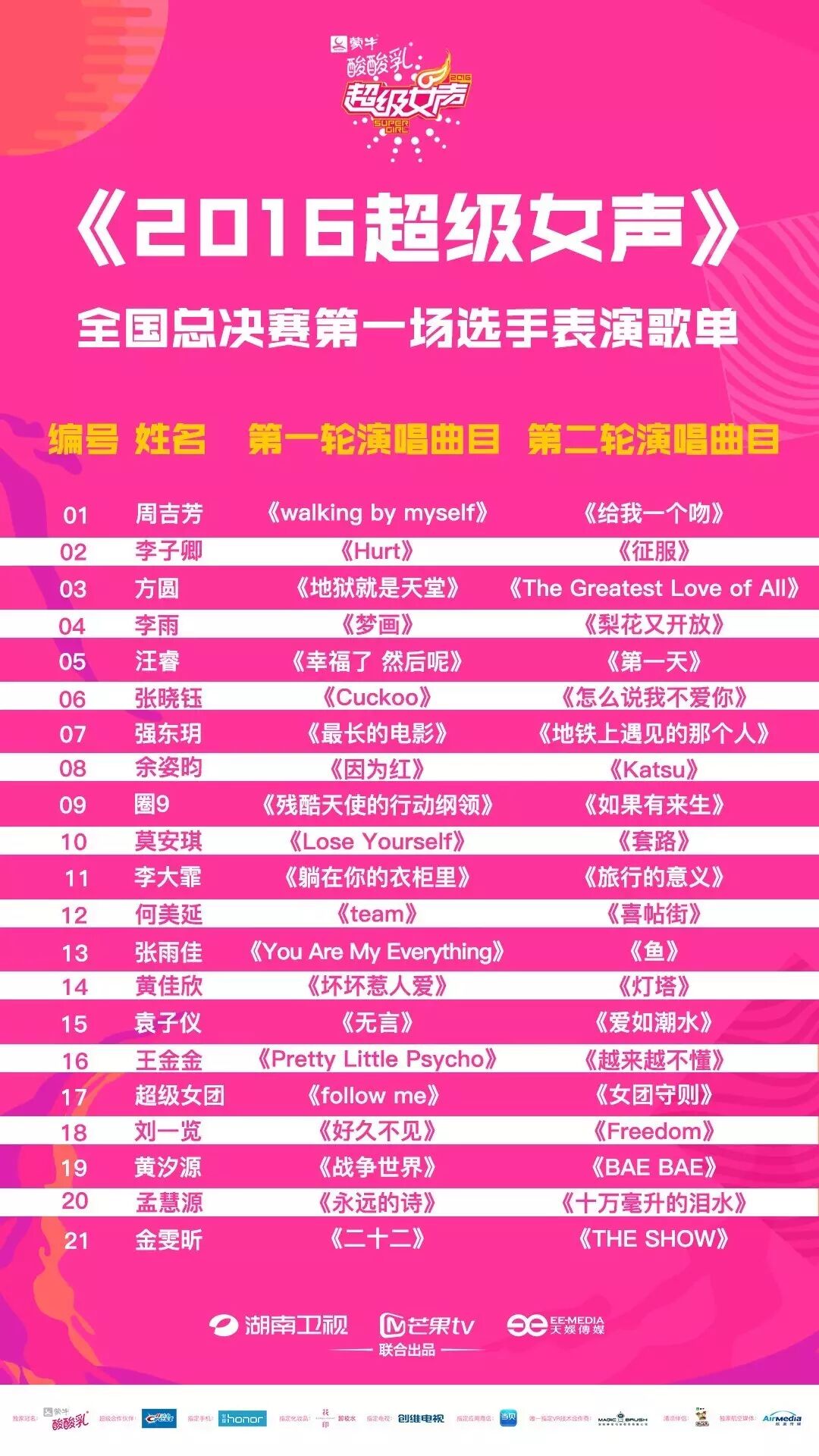 细心的宝宝一定想问?为什么是21强,难道不应该是20强吗?果妈告诉你!那是因为今年超女采取20+1的模式,不仅仅有从61万超女中脱颖而出的全国前20强,还有由15只萌妹子组成的超级女团。届时,会有21股力量共同角逐超女舞台,为梦想开唱。
