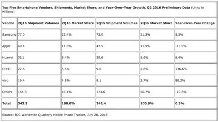 美国调研公司IDC数据显示,2016年Q2数据中,三星同比增长5.5%,苹果同比下滑15%,华为同比增长8.4%,在这种背景之下,OPPO同比增长136.6%,全球排名第4。