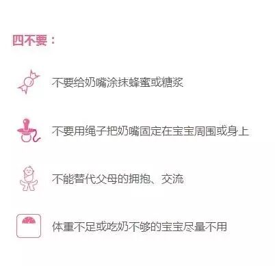 正在使用奶嘴的妈妈们也要注意了:安抚奶嘴只能在忙不过来或特殊场合帮你一时,通过安抚、拥抱、交流、轻摇等方式给宝宝精神抚慰,才能让他更有安全感、更健康的成长。